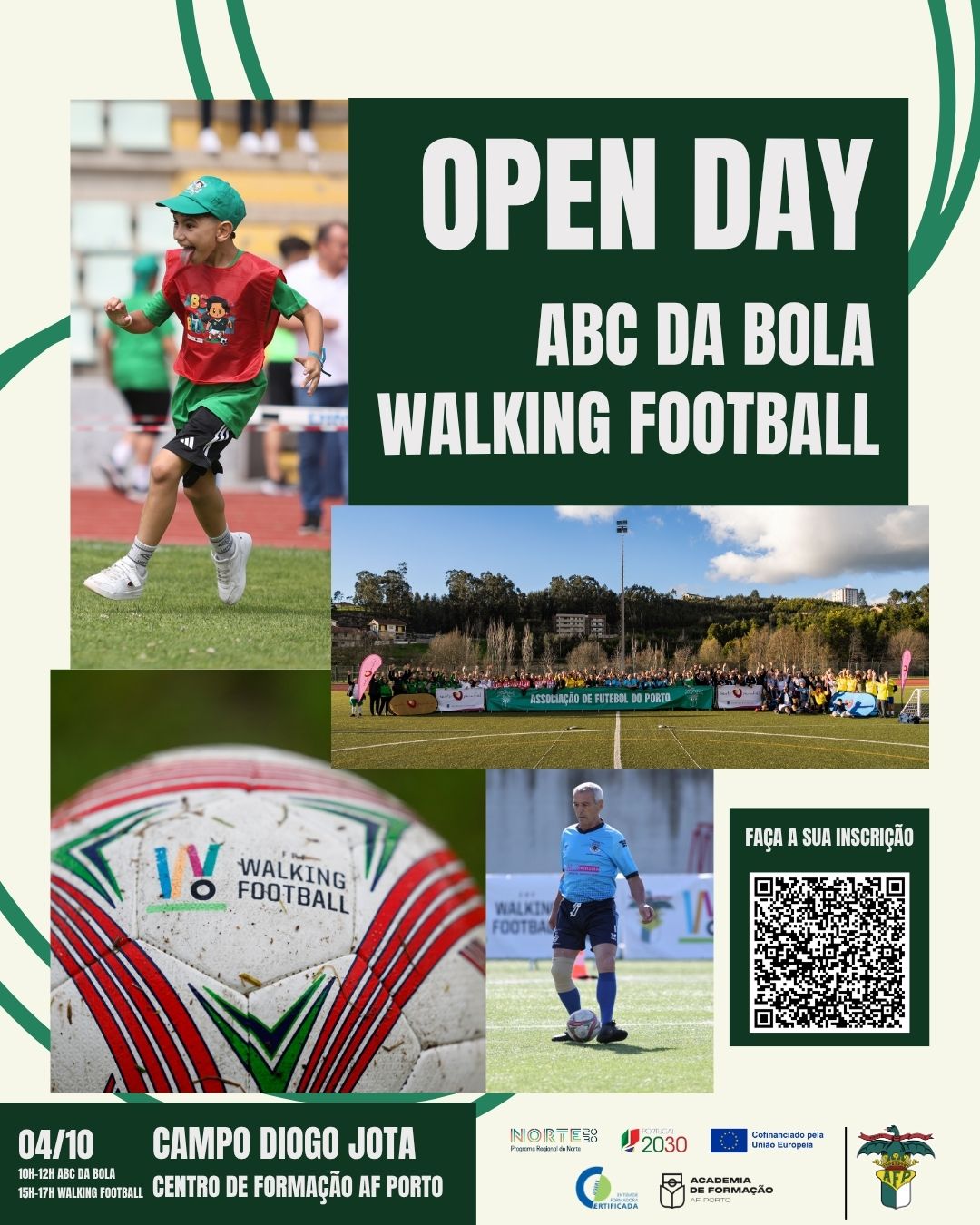 No próximo dia 04 de outubro (sábado), vai decorrer o primeiro Open Day | Walking Football e ABC da Bola. Esta iniciativa dupla vai decorrer entre as 10h00 e as 17h00, no Campo Diogo Jota, no Centro de Formação da Associação de Futebol do Porto.